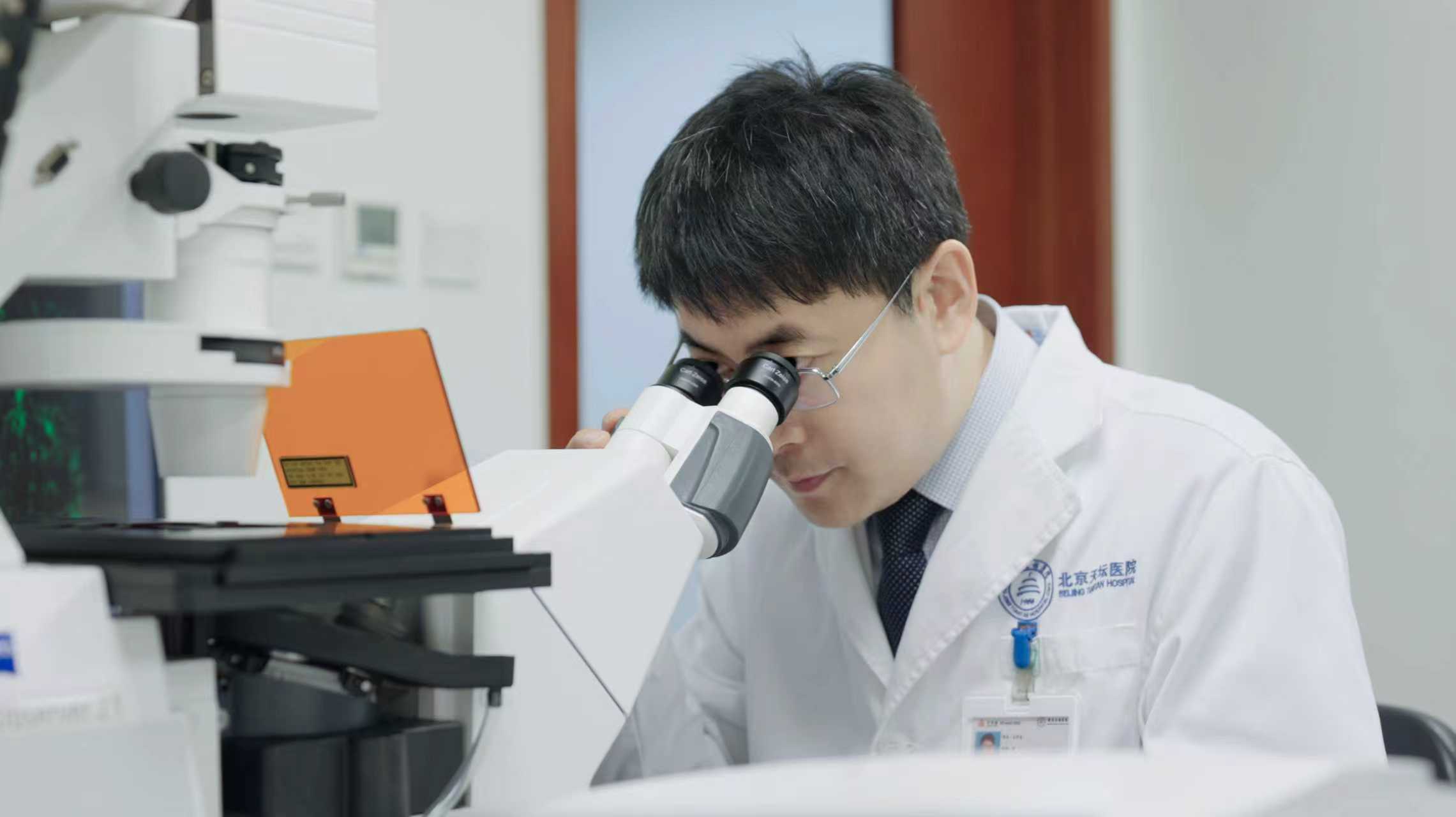 天坛医院常务副院长王伊龙通过共聚焦显微镜观察渐冻症样本免疫荧光染色。图源:天坛医院