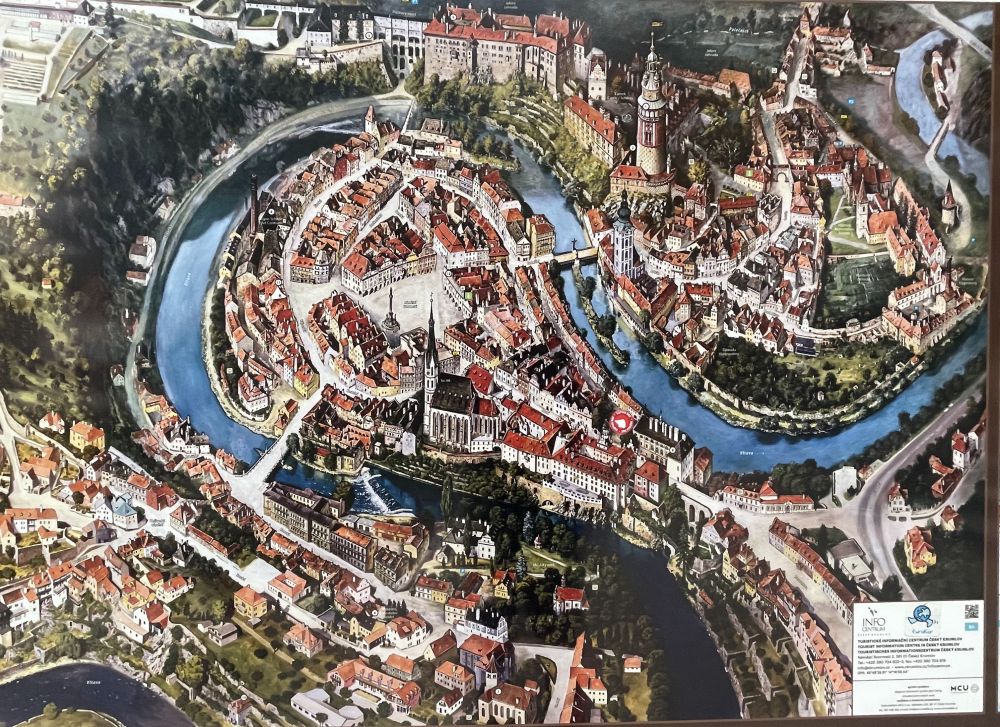 一般游览小镇,我都不做攻略,让自己被惊喜。所以看到这张小镇全景地图,才发现伏尔塔瓦河从南向北流经小镇中心,蜿蜒出一道优美的马蹄形河湾。