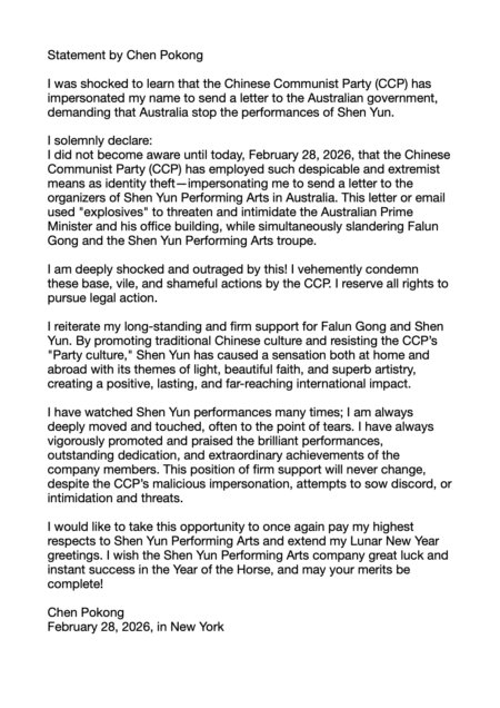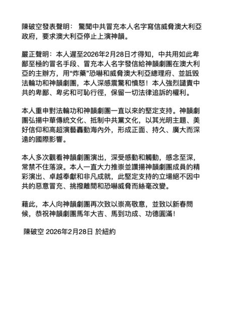 2月28日,旅美作家、政论家陈破空发表声明,强烈谴责中共盗用其名义发恐吓信、威胁炸澳洲总理官邸以阻止神韵在澳洲演出的卑劣行径,他同时表示将保留一切法律追诉的权利。