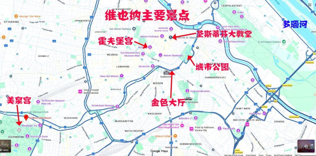 作为“音乐之都”,维也纳与莫扎特、贝多芬、舒伯特等大师紧密相连,金色大厅与国家歌剧院几乎是古典音乐的圣殿。重要地标包括 美泉宫(Schloss Sch?nbrunn)、霍夫堡宫(Hofburg Palace)、圣斯蒂芬大教堂(St. Stephen’s Cathedral) 以及环绕老城的 环城大道。古典与现代在此并行不悖,使维也纳既庄重,又宜居。20世纪80年代我们曾两次来过维也纳,此次也是故地重游。