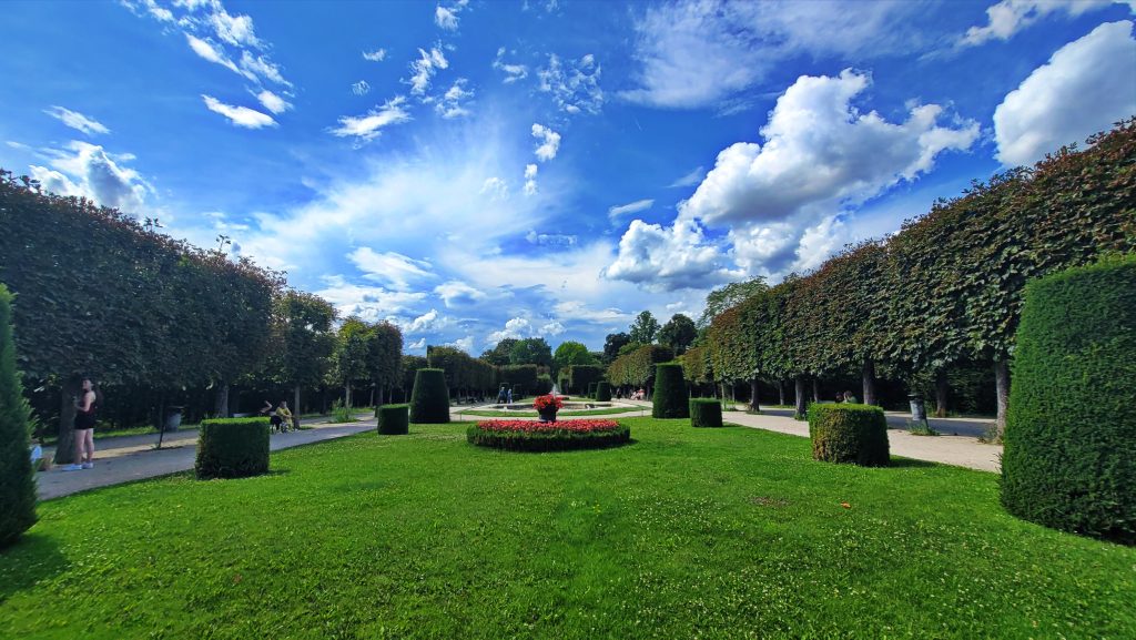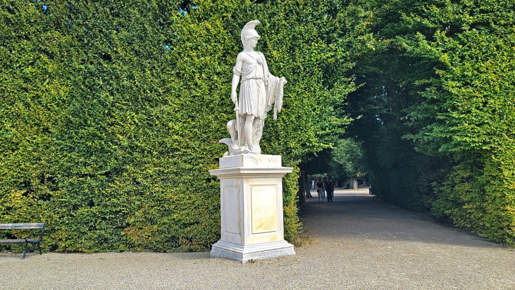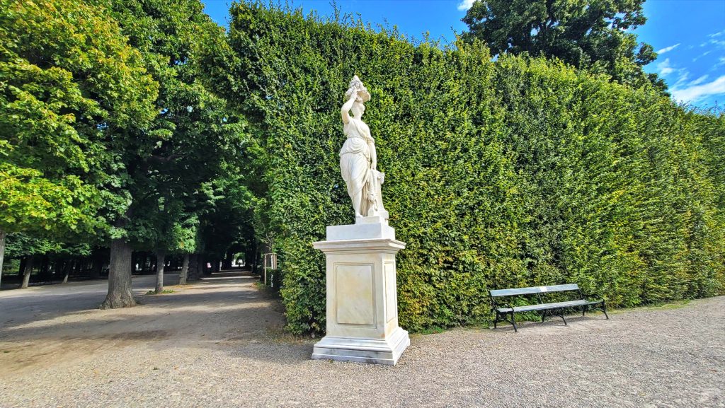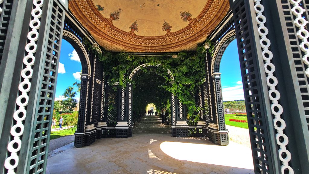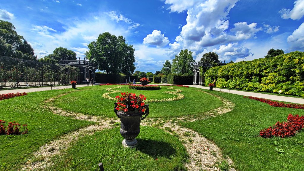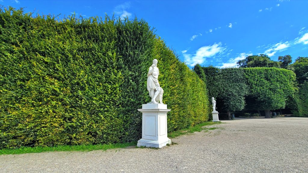 美泉宫殿背后的大花园是整个建筑群气势的延伸。沿着中轴线向外展开,草坪与花坛层次分明,道路两侧排列着32座神话人物与寓意雕塑,姿态各异。向远望去,中轴前段可见海神喷泉,轴线尽头,山丘上的 美泉宫凯旋门(Gloriette) 高高耸立。