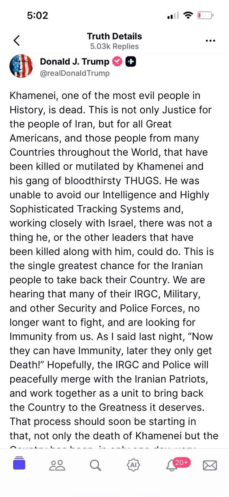 其实在看到川普的最新帖文时,我就知道,哈梅内伊已死。川普在发布这类大事时,还是在乎他的信用的,不会乱说话。