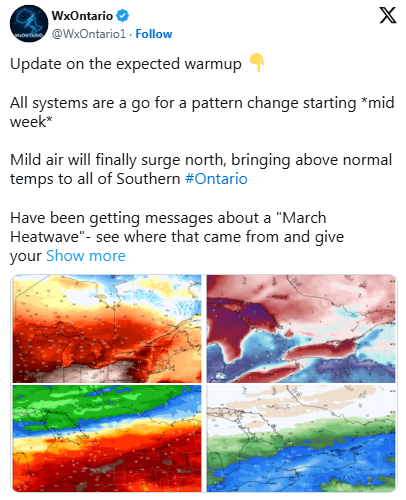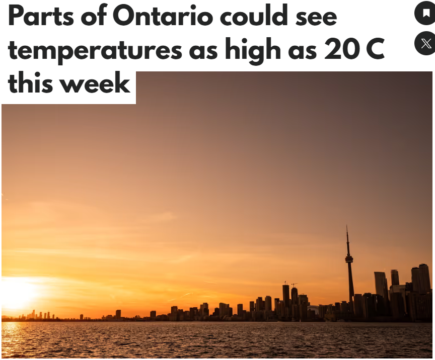 不过,从气候规律来看,多伦多气温确实会在本月快速回升:3月1日的平均最高气温为2℃,到月底则上升至约9℃。