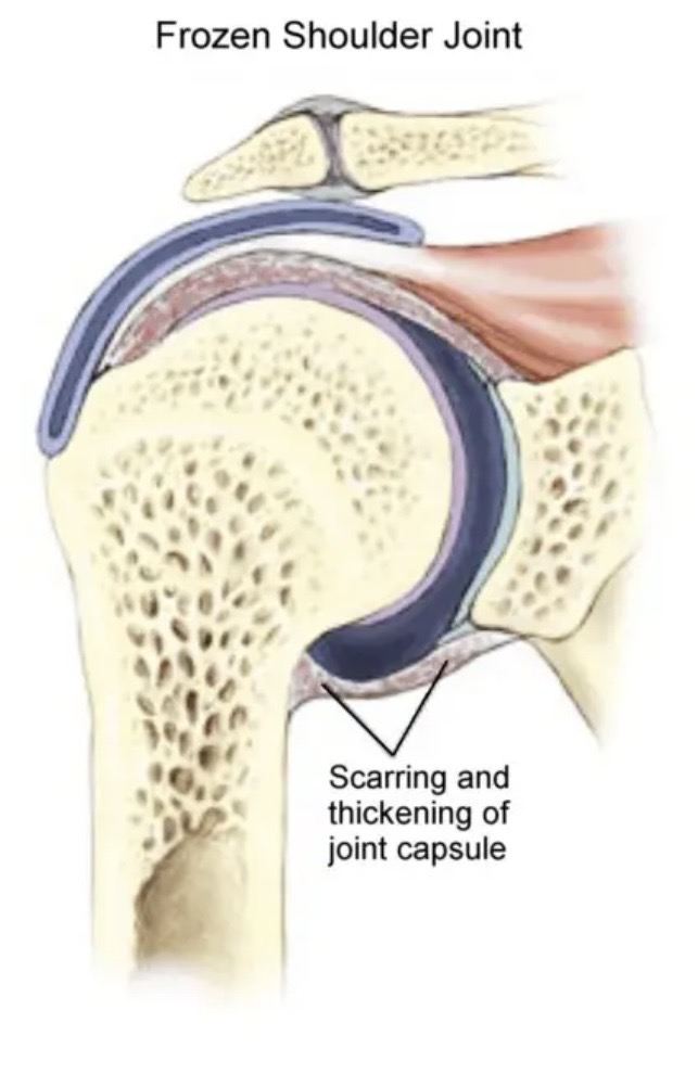 肩关节囊(关节周围的软组织)发炎并变得紧绷,严重限制肩关节活动。