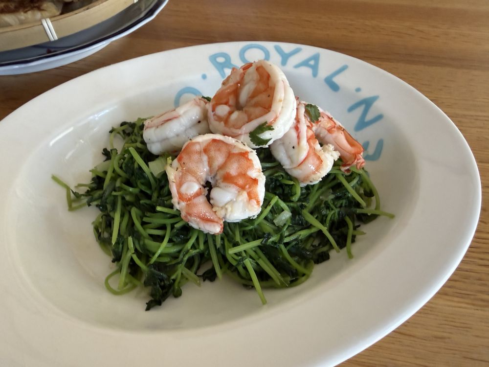 豆苗虾仁,也不用油,先把虾仁盐搓,然后用流水一直冲洗,再焯水过冷水,加一点柠檬汁和胡椒粉入味;豆苗直接放锅里炒,然后放一点盐,出水后倒掉。