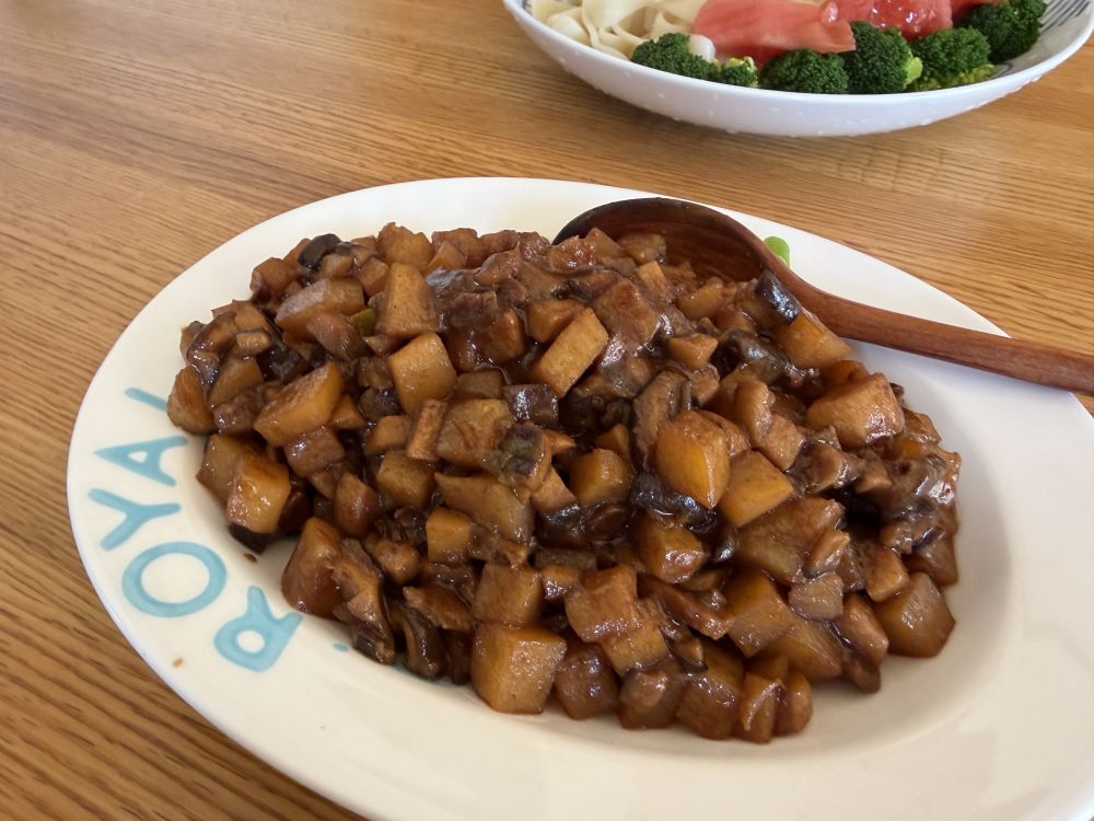 家里没啥吃的了,就用土豆和香菇,杏鲍菇做的炸酱,酱是用葱伴侣黄豆酱,这个酱很好吃的。要包菌菇炒到焦黄有香味出来,调味料用大料或者五香粉,油要多一点,也要放一点香油。