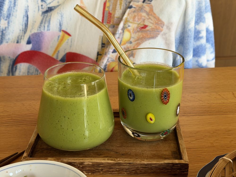 每天早上都来一杯绿色的蔬果汁,里面有时是菠菜,羽衣甘蓝,有时是萝卜缨子白菜芯儿。前一段时间是草莓盛产时节,就做红色的蔬果汁,家里还有冰冻的西红柿,因为是自家产的,可以直接用来大蔬果汁。