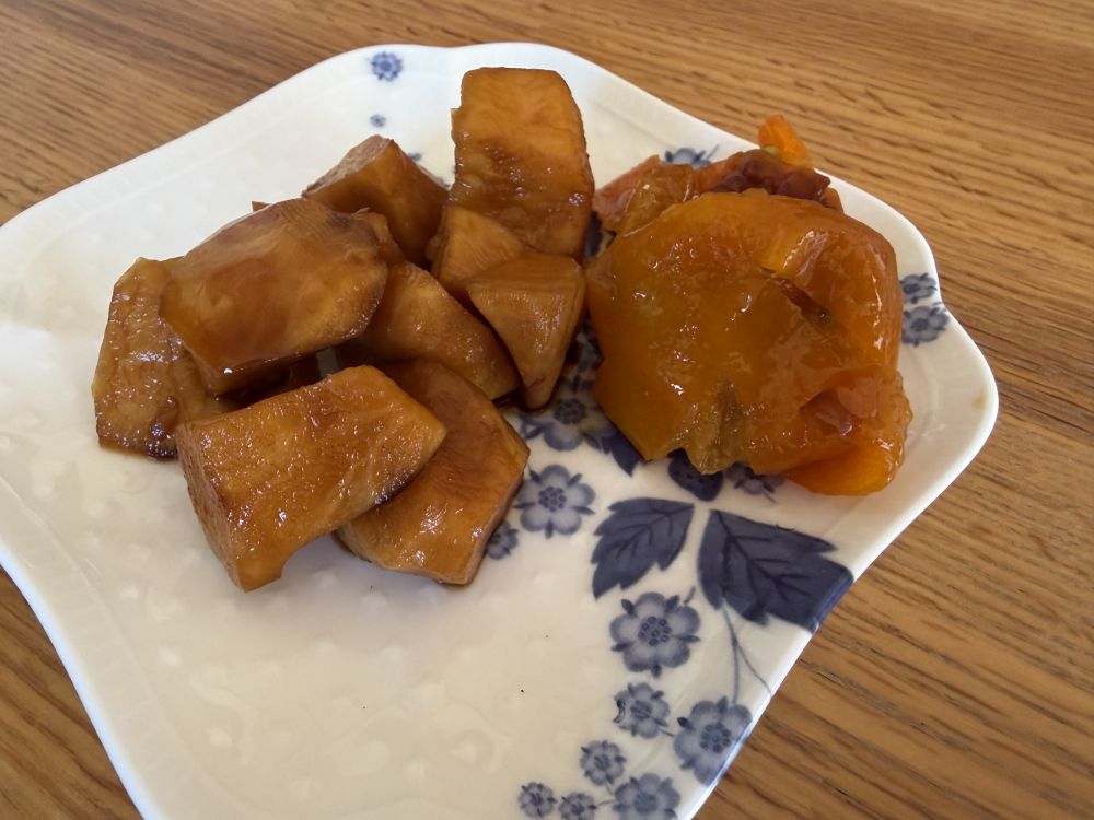咸甜拼盘。邻居种的鬼子姜,腌咸菜,蜂蜜小金桔,润喉的。