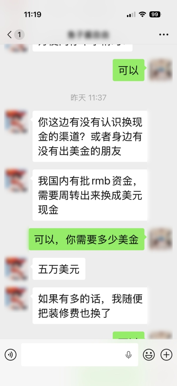 薛先生回顾整个疑似遇诈骗的过程,对方先透过微信群组加为好友,随后提出大额换汇要求,表示愿意以人民币转账换取美元现金,并希望尽快完成交易。“一听就知道不对劲,哪有人这么急着换这么大笔现金?”他表示,这类私下换汇本身风险极高,在美国亦涉及法律与金融监管问题,因此立即终止联系。