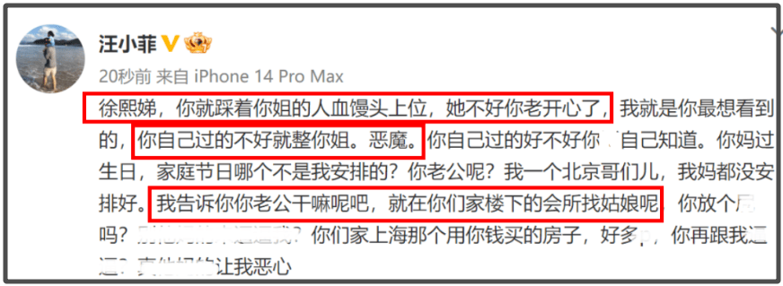 ——后来汪小菲和大S离婚,跟S家全家都不和。汪小菲当年骂S家的时候,讽刺具俊晔吃软饭,指责小S吸血大S,但因为他当年情绪疯狂,再加上被爆料出轨,没人信他还因此招骂。