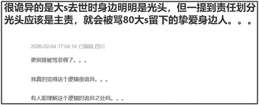 也怪不得S家在大S去世后,口碑会逐渐下滑,小S生前没照顾好大S,大S去世后,没照顾好大S的孩子,但却躲在“大S家人”标签的保护下,不能被吐槽,否则就是支持出轨男,消费逝者,或者被打上“菲佣”的名头……