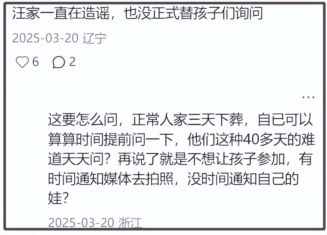 至于大S儿女没被通知去大S丧礼,没被邀请去大S悼念仪式,也不是S家无情,要怪就怪汪小菲,全是汪小菲这个前夫的问题呗……