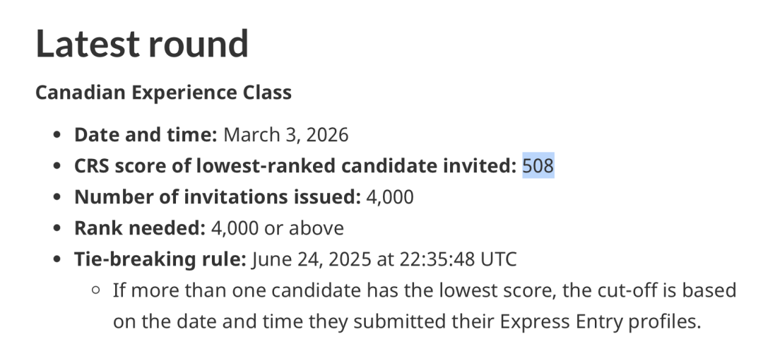 3月3日,加拿大Immigration, Refugees and Citizenship Canada(IRCC)再次通过 Express Entry 系统发出新一轮邀请。本轮为Canadian Experience Class(CEC)专场抽签,共发出 4,000 份 ITA,CRS 分数线降至 508 分,继续在近两年低位区间徘徊。