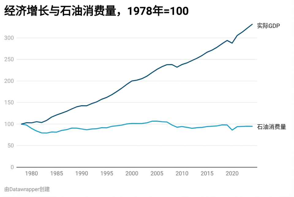 美国经济规模已扩大至原来的三倍,但目前的石油消耗量却与20世纪70年代末基本持平。