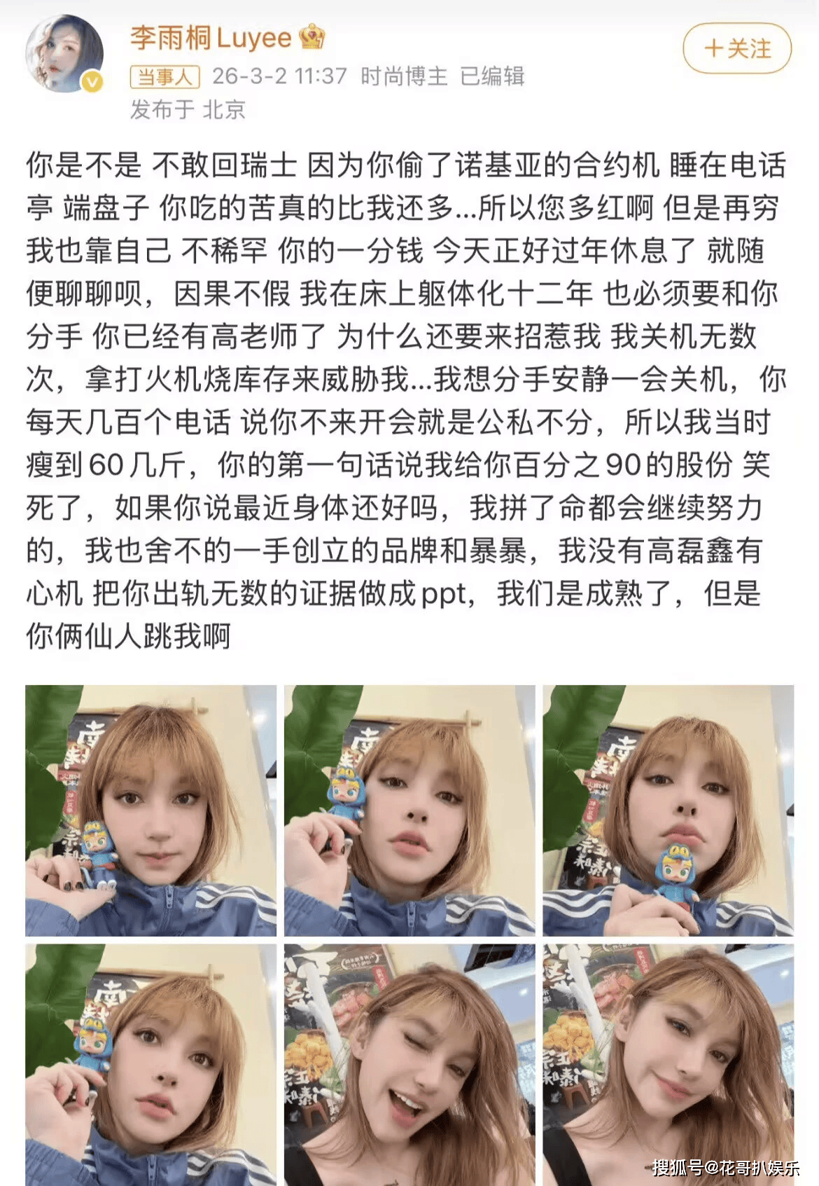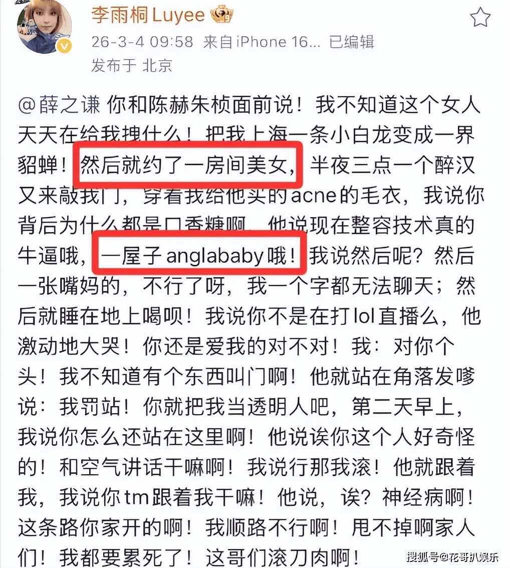 不过和当年的雷神之锤不同,李雨桐此番爆料画风突变,言语混乱毫无逻辑,一会儿怒骂薛之谦精神状态堪忧,直指对方行为怪异。一会儿又爆料高磊鑫在薛之谦家中安装监控,全程掌控对方行踪。甚至放出下蛊这种离奇说法,称高磊鑫用非常规手段控制薛之谦,连她自己也受到影响。通篇发言颠三倒四,前后矛盾,没有任何实质证据支撑,全是情绪化宣泄,原本期待实锤的路人纷纷失望,愿意站队支持她的人少之又少,这场单方面控诉,反倒让薛之谦的陈年风流韵事被彻底扒出,每一条都足够颠覆三观。