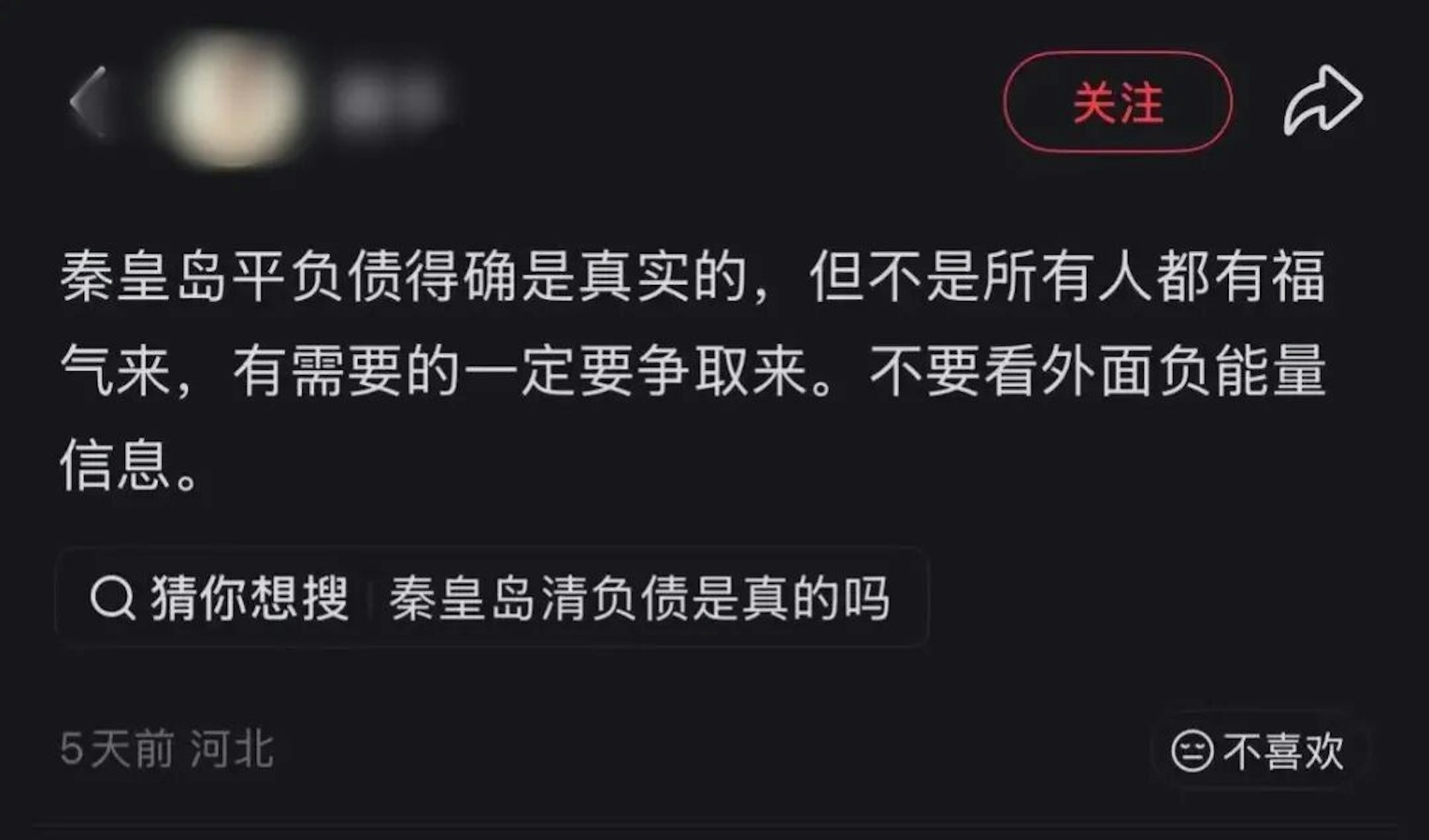 为了增加可信度,宣传者还会配上一张百度生成的科普截图,截图上写着看起来很权威的官方解释,还特别把秦皇岛三个字圈了出来。评论区时常有人现身说法:平债百分百是真的,而且不需要交一分钱。如果你还是怀疑,会有人告诉你“信者得福”,别听外面的人胡说八道。