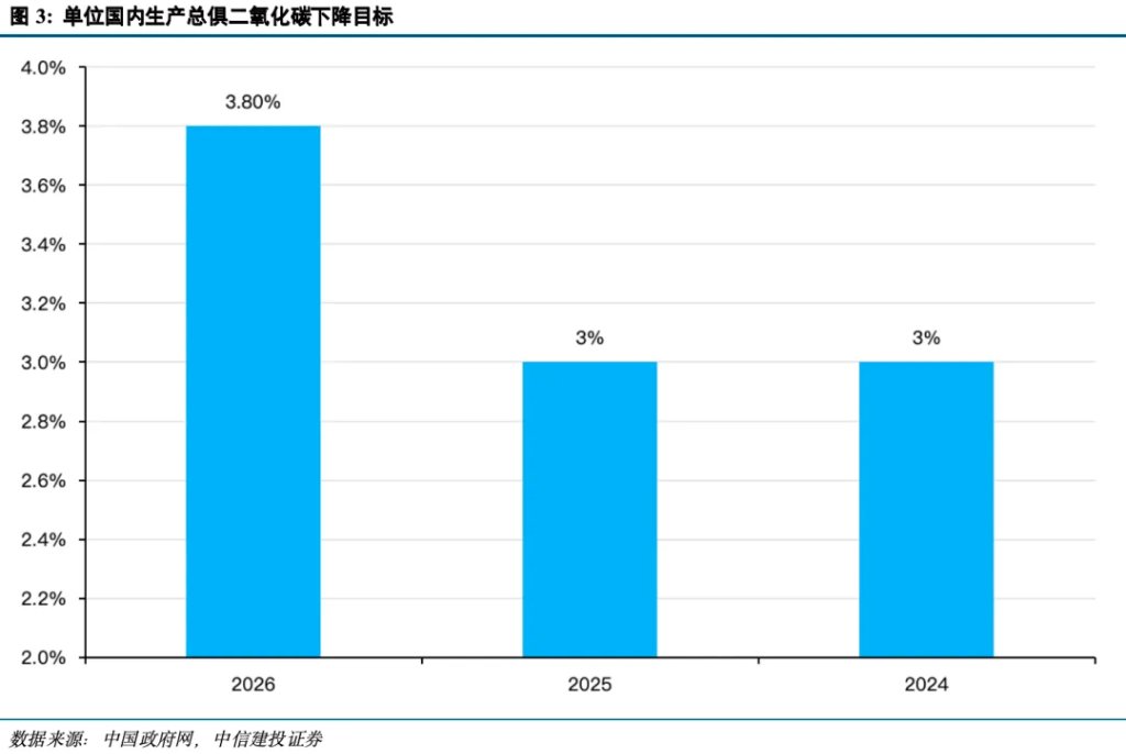 2026年政府工作报告明确设定了单位国内生产总值二氧化碳排放降低3.8%左右的预期目标。