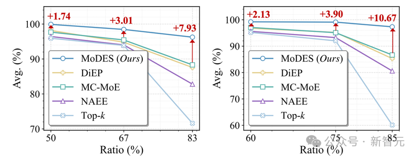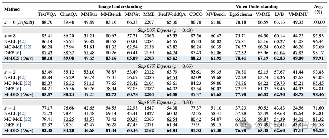 通过显式建模不同层专家对最终输出分布的全局贡献,以及不同模态token在专家网络中的更新特性,MoDES证明了一件重要的事情:即便跳过80%以上的专家,只要跳得足够“聪明”,模型性能依然可以稳定保持。