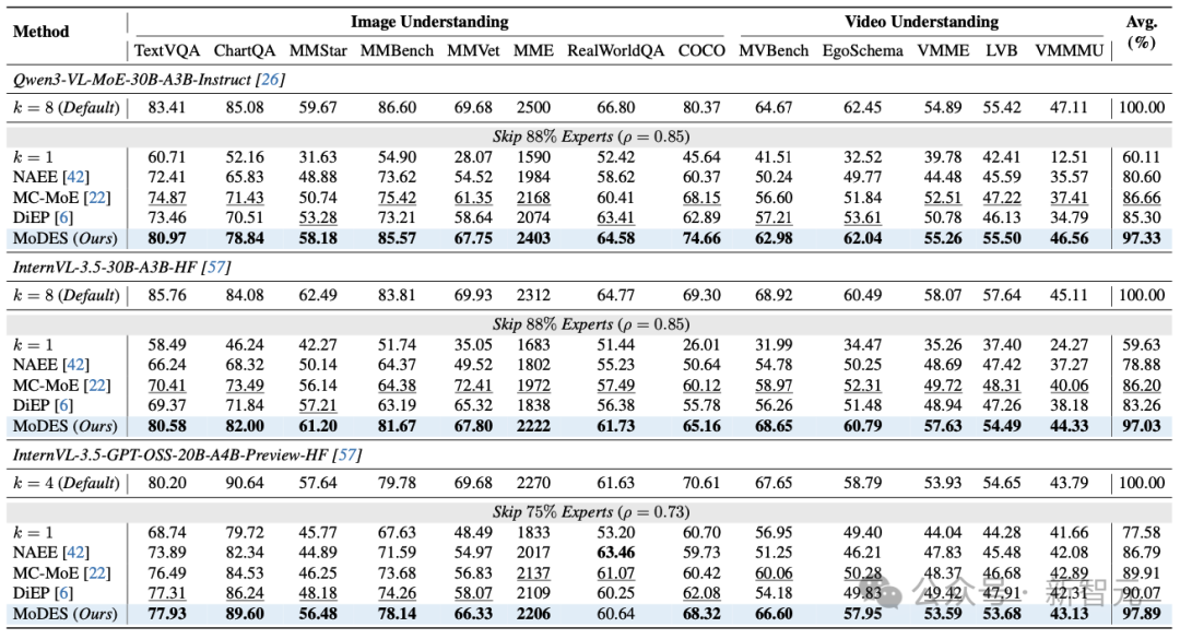 在Qwen3-VL-MoE-30B上,MoDES在跳过88%专家的情况下,仍保留97.33%原始性能,同时带来显著推理加速,打破了一个长期存在的共识:高比例专家跳过必然带来不可接受的性能损失。