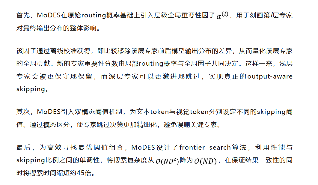 MoDES的核心贡献在于:提出了一种真正output-aware、modality-aware的多模态专家跳过机制。