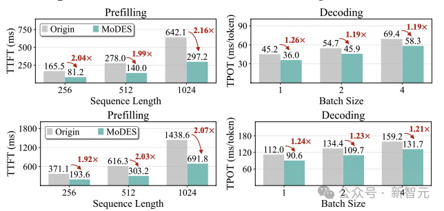 在实际推理测试中,MoDES在H200 GPU上实现了显著加速。在Prefill阶段获得约2×加速,在Decoding阶段仍有约1.2×提升(见图表 8)。由于MoDES为training-free方法,推理阶段不引入额外计算开销,因此加速效果更加稳定。