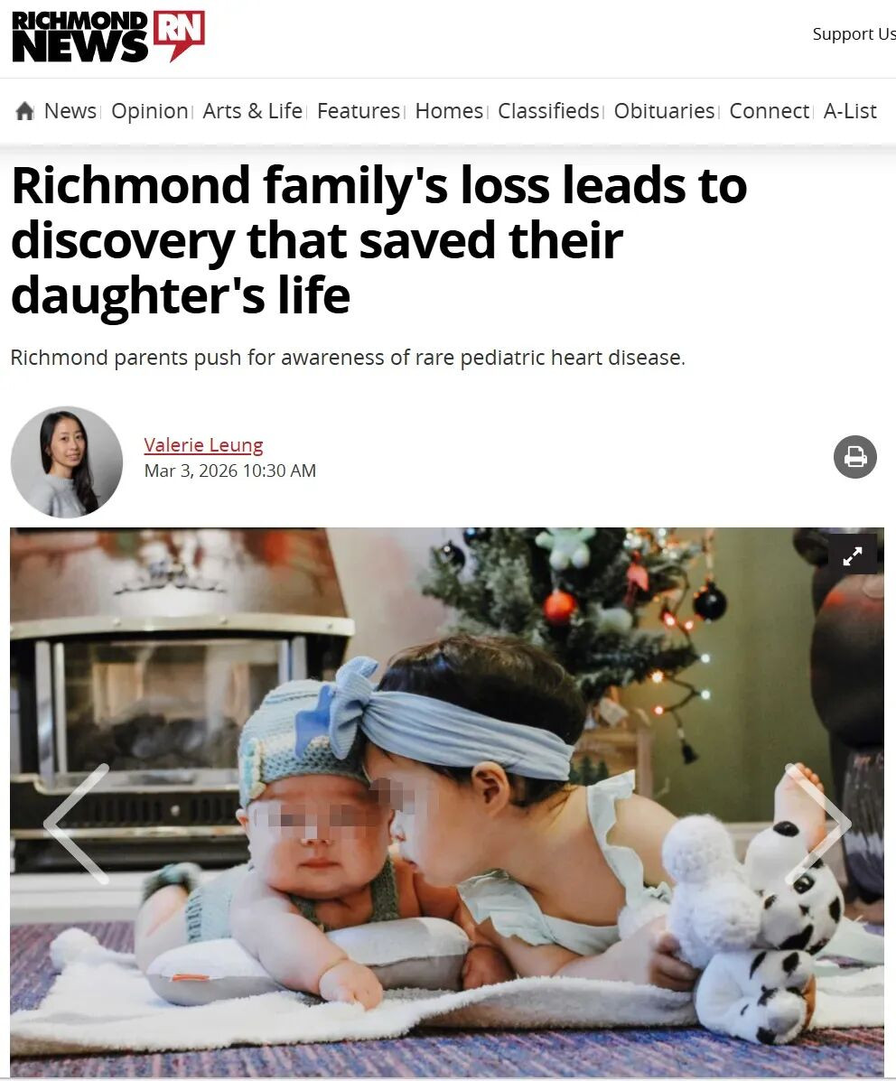 在列治文,有一个华人家庭的故事,让很多人看完之后都忍不住落泪。几年前,他们失去了一个13个月大的儿子,但也正因为这场悲剧,医生发现了女儿体内隐藏的致命疾病,最终救了她一命。