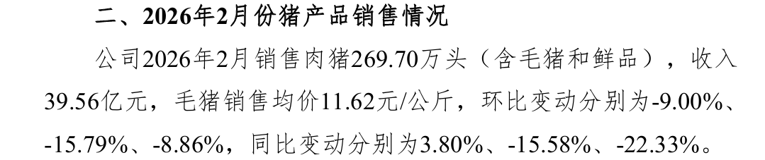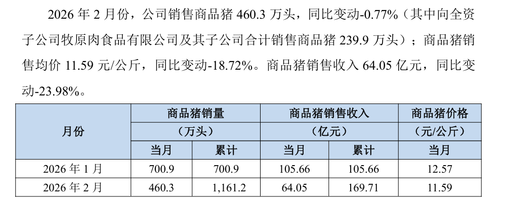 牧原股份3月6日的《2026 年2月份销售简报》显示:“商品猪销售均价11.59元/公斤,同比变动-18.72%。商品猪销售收入64.05亿元,同比变 动-23.98%。”