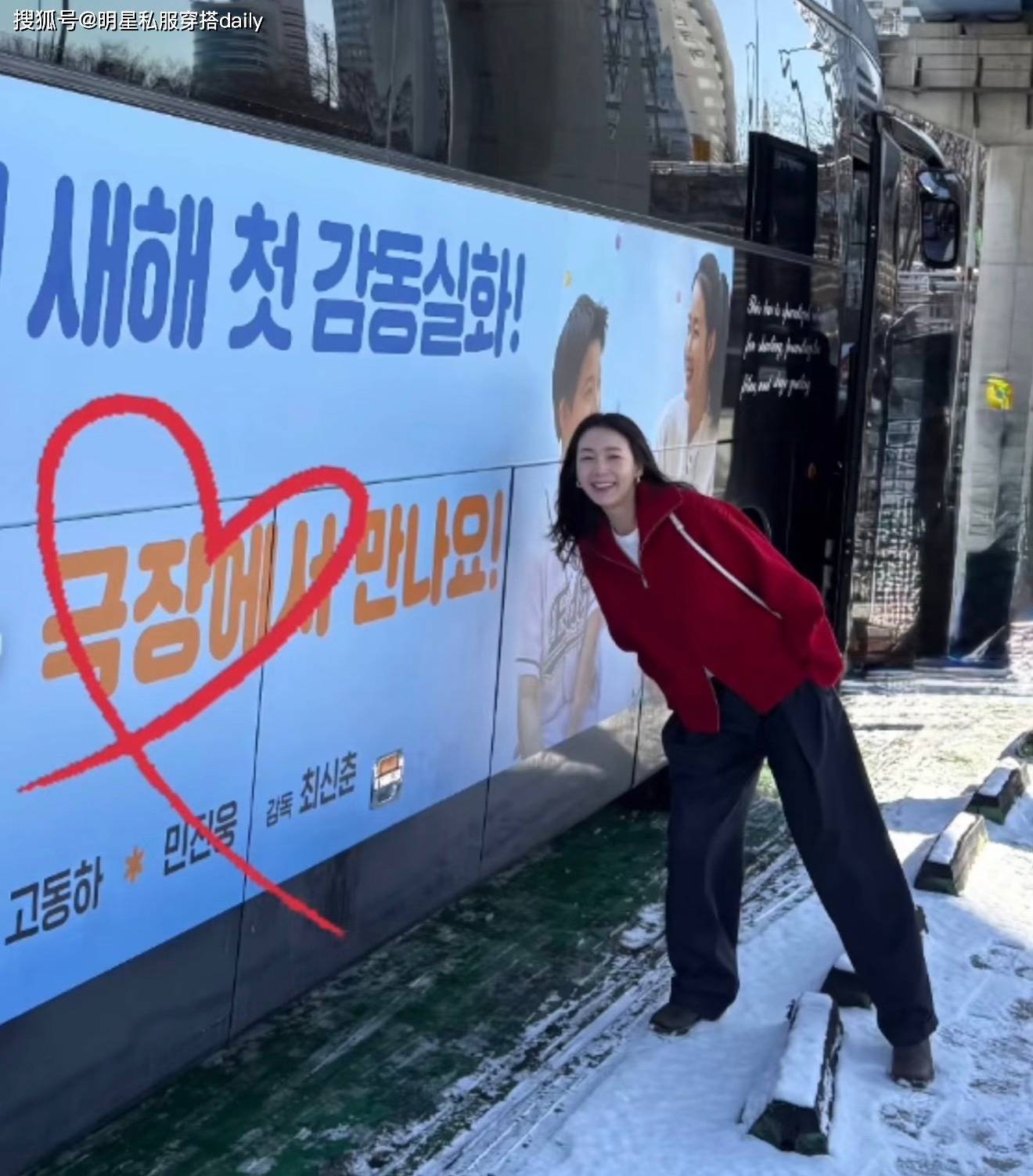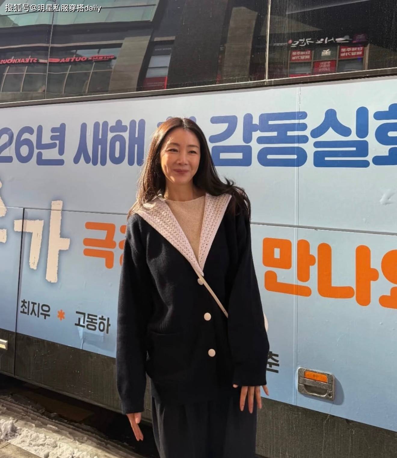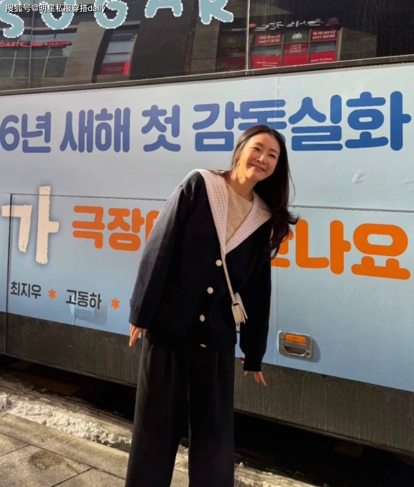 红色针织开衫是具有节日氛围的单品,但日常内搭白色T恤也很日常,尤其是像崔智友这样下半身搭配灰色阔腿裤,尽显知性大方!