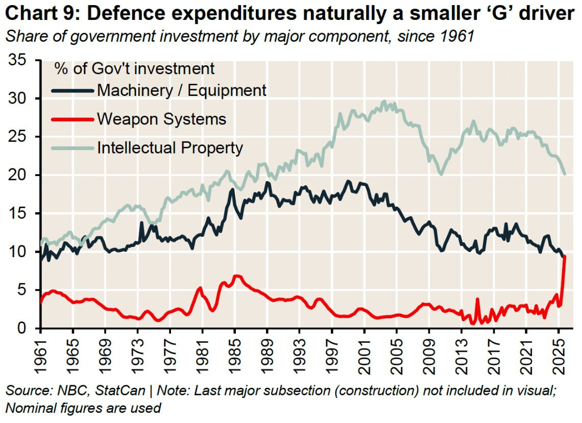 无论是谁借钱,只要借贷增加,债券收益率都会上升。但报告认为,债务用途的结构同样重要。投资者通常更能接受用于长期生产性资产的债务,而不是用于日常开支。NBC认为:“随着时间推移,更高的国防支出可能会重新激活加拿大的制造业基础,而这一领域近年来在全球的影响力不断下降。”不过报告也强调,这并不等于问题已经解决。这更像是“被打在肚子上,而不是更痛的地方”,痛苦减轻了,但依然存在。国防制造业或许能带来短期缓解,但它仍然高度依赖政府需求,而不是市场驱动的增长。如果没有足够强大的私人经济基础支撑,最终结果只是让公众承担更大的债务负担,外加利息。