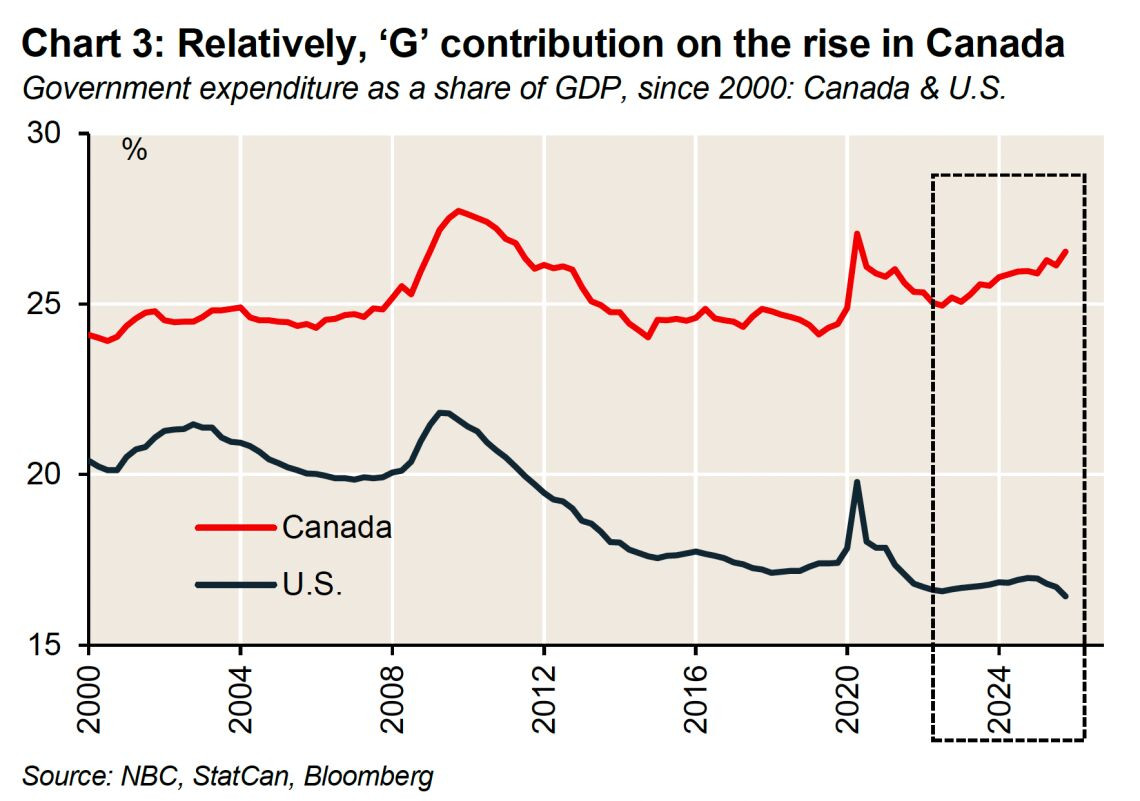 报告指出:“在与美国经济对比中,政府支出增长几乎是加拿大唯一的优势,而美国在其他经济增长领域的表现都更强。”不过报告也提到,加拿大政府支出中用于固定资本投资(而非日常消费)的比例正在上升。