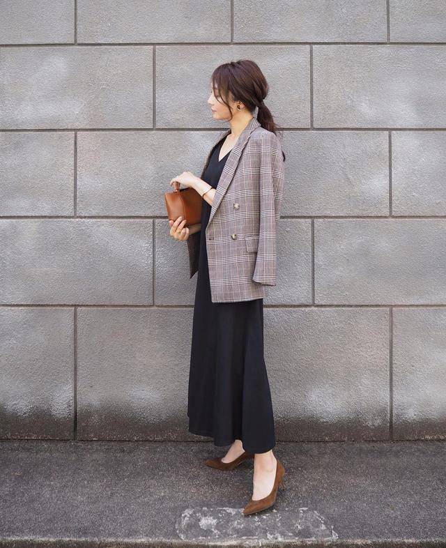 春天最适合穿小棕鞋,低跟鞋的款式,精致有女人味儿,配条黑色醋酸裙,露点脚踝好显瘦。