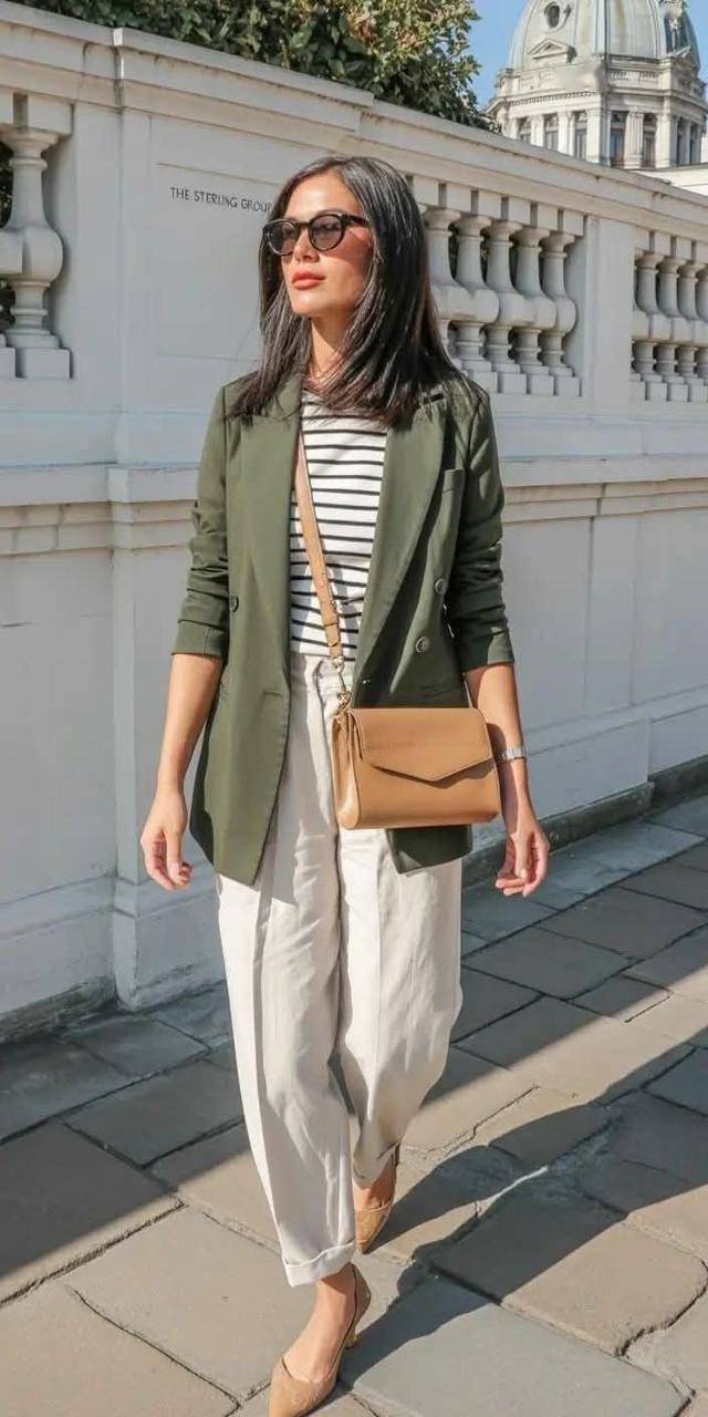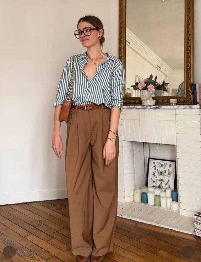 别把衬衫穿的太死板,领口解开两颗,袖子挽到手肘,将头发盘起来,戴对金属耳环,吸引力拉满,小棕鞋都变成了陪衬~