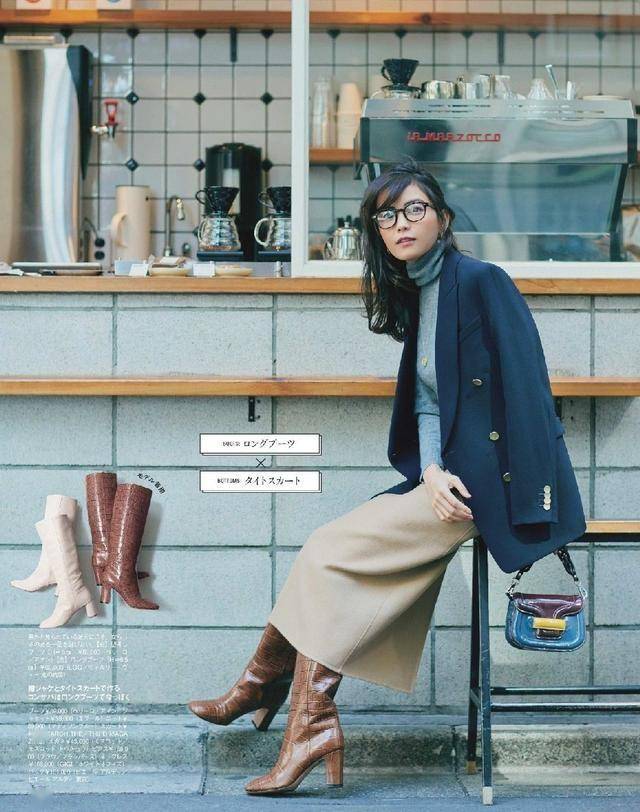 琥珀流光色的粗跟靴,最适合配卡其色直筒裙,哑光和亮面的碰撞,深浅分明,是造型的层次感更加强烈。