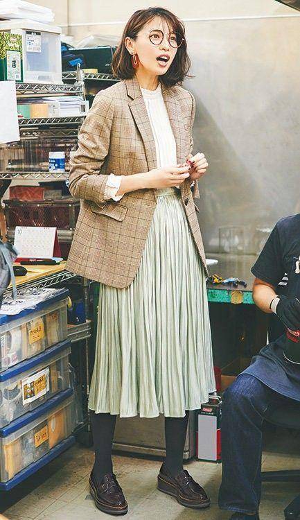 淡绿色百褶裙出现的那一刻,让棕色乐福鞋有了救赎,一脚蹬的设计,穿脱方便,亮面牛皮更是充满着复古质感,越穿越有味道。