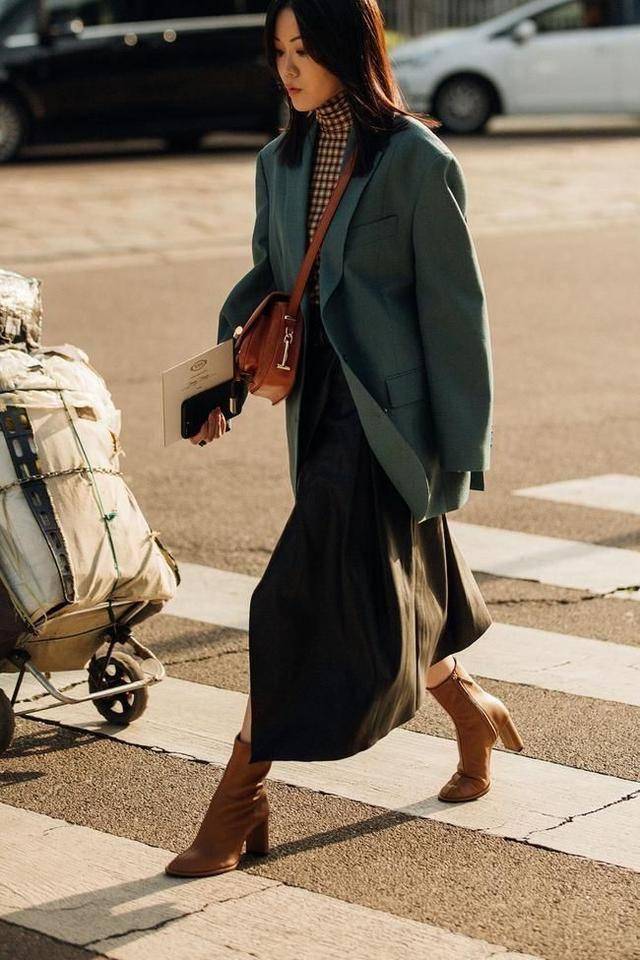 廓形设计的西装外套,建议可以搭配开叉裙,又美又飒超吸睛,踩双粗跟踝靴,若隐若现露出脚踝线条,轻松拯救好气质。