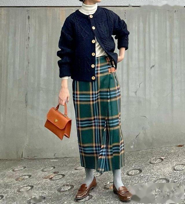 擅长运用叠穿的姐妹,通常都很有品位,白色高领打底衫叠穿藏蓝色毛衣外套,用格子裙丰富造型,鞋子轻便一点更轻盈。