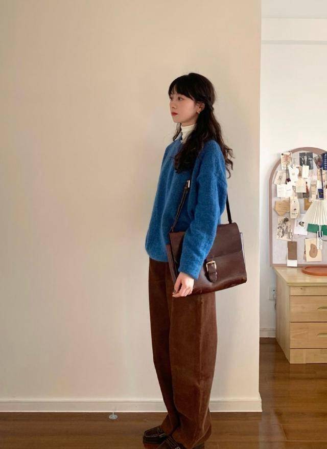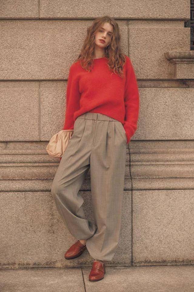 红毛衣配卡其色西装裤,踩双红棕色乐福鞋,风格和色彩相互扶持。