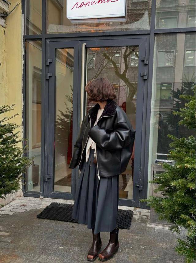 廓形设计的哑光感皮衣,配条百褶裙很有少女气息,再用焦糖棕色的切尔西靴维持酷飒感即可。