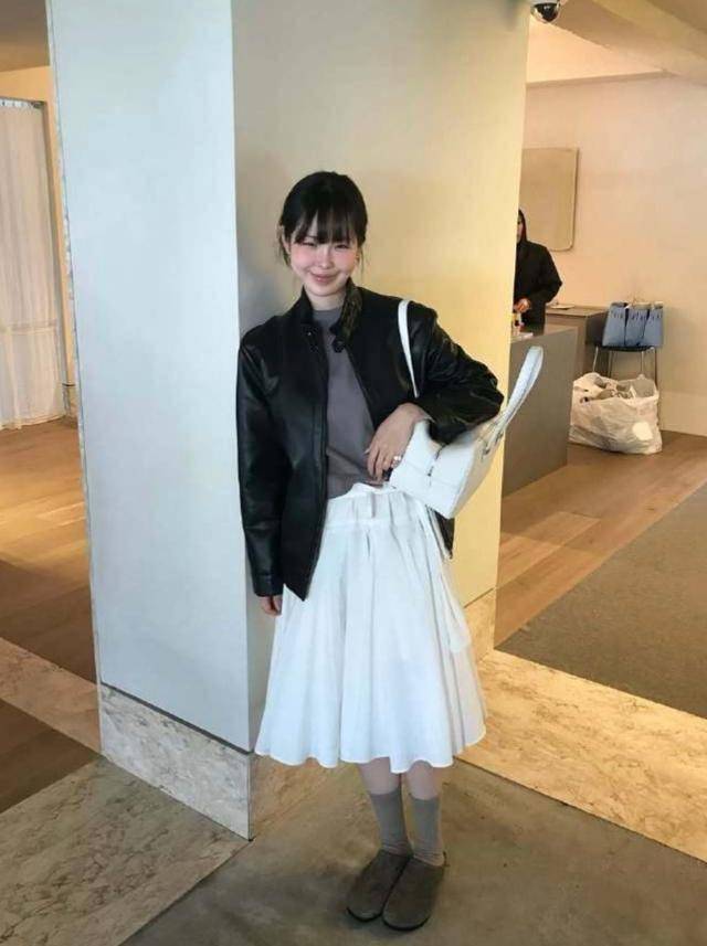常见的白T恤,叠搭麂皮夹克,配条风琴裙,鞋子选同色系,协调感更好。