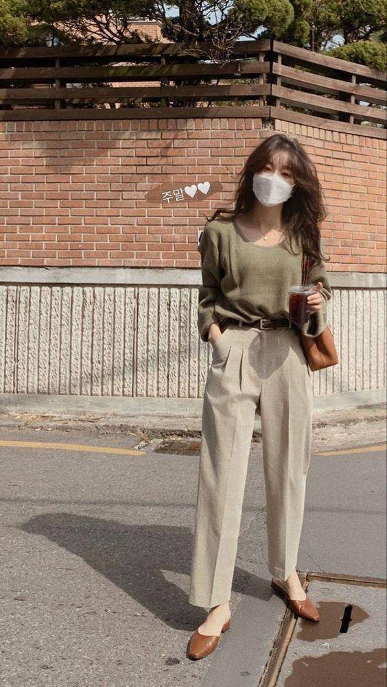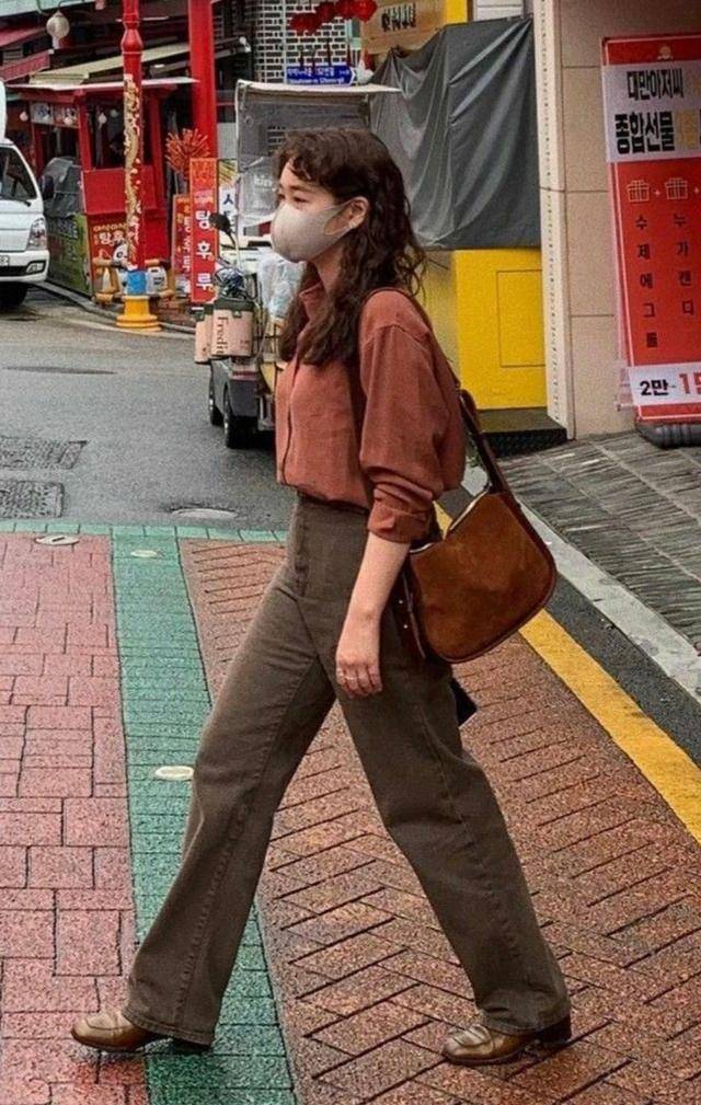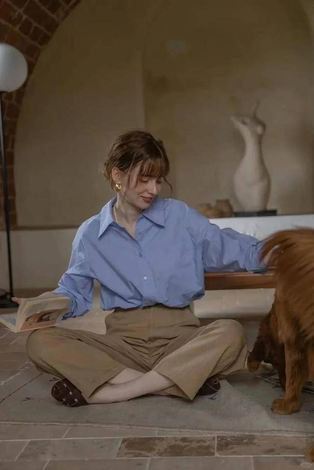 鞋跟3~5cm的小棕鞋,裤腿盖住鞋面,衬衫塞进裤腰超显腿长。