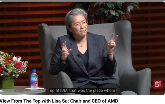 说完老黄,再来看看苏姿丰苏女士。给我的印象是一如既往的沉稳,严谨,思维有条理。在接受斯坦福商学研究生院的访谈时,她讲起自己的职业生涯,说是在IBM成长起来的,又马上补充在其他企业的经历,尽管那些工作的时间并不长。