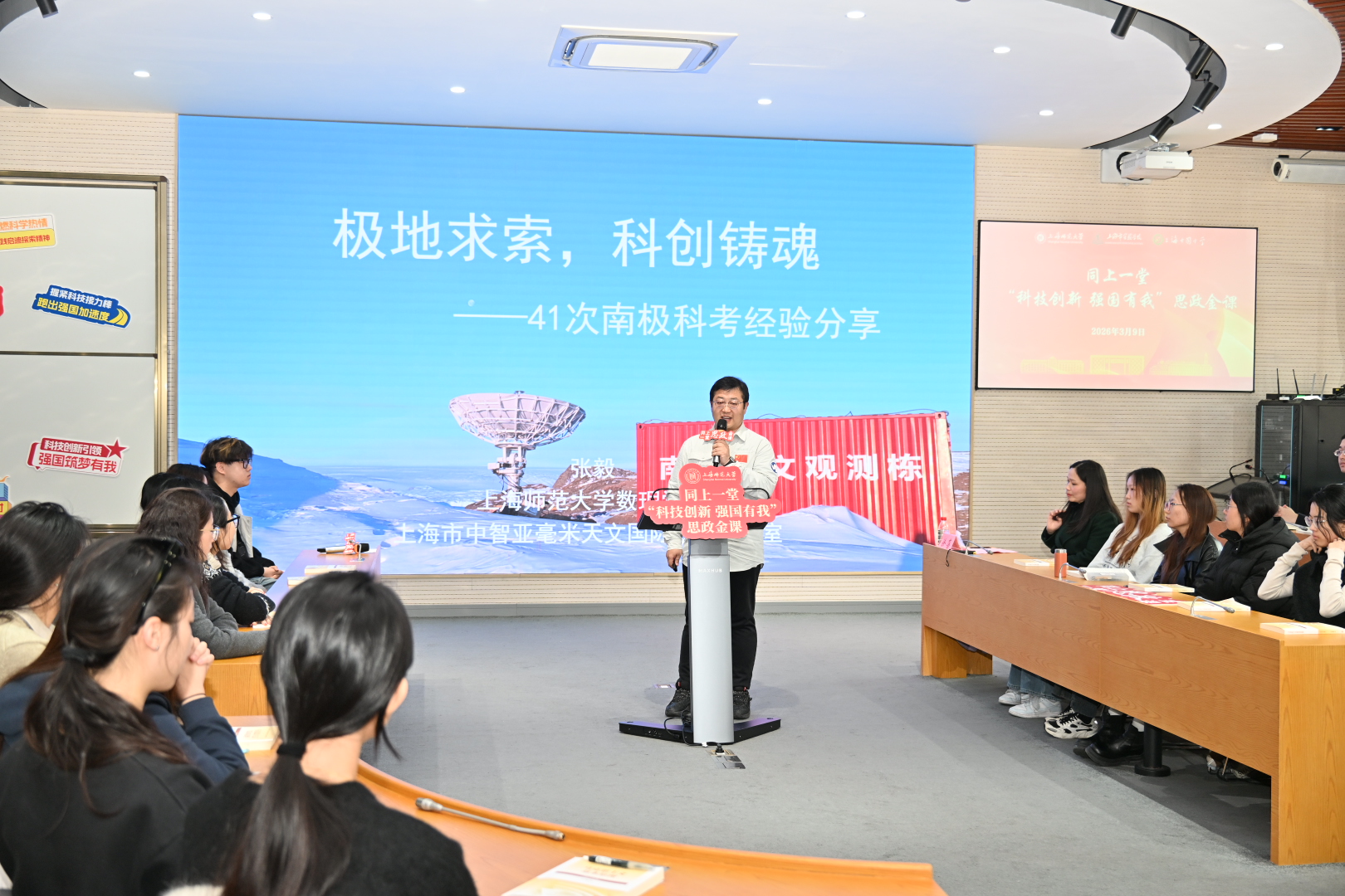 中国第41次南极考察队队员、上海师范大学数理学院教授张毅结合第41次南极科考越冬考察的亲身经历,生动阐述了极地科考对于国家战略安全的重要意义以及极地科考背后蕴含的科创精神。张毅重点分享了国产装备在南极科考中的广泛应用与重要作用,指出这些实践充分印证了“关键核心技术要不来、买不来、讨不来”的硬道理,彰显了我国坚持自主创新的坚定决心与显著成效。他勉励青年学生,以“坐得住冷板凳、啃得下硬骨头”的韧劲,以科考精神为帆,以青春理想为桨,在科研中沉淀匠心,在实践中锤炼本领。