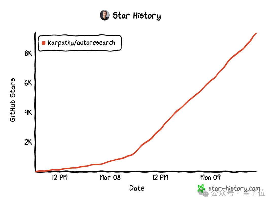 发布才不到两天,autoresearch 斩获的星标数就已经超过了 9.5k。