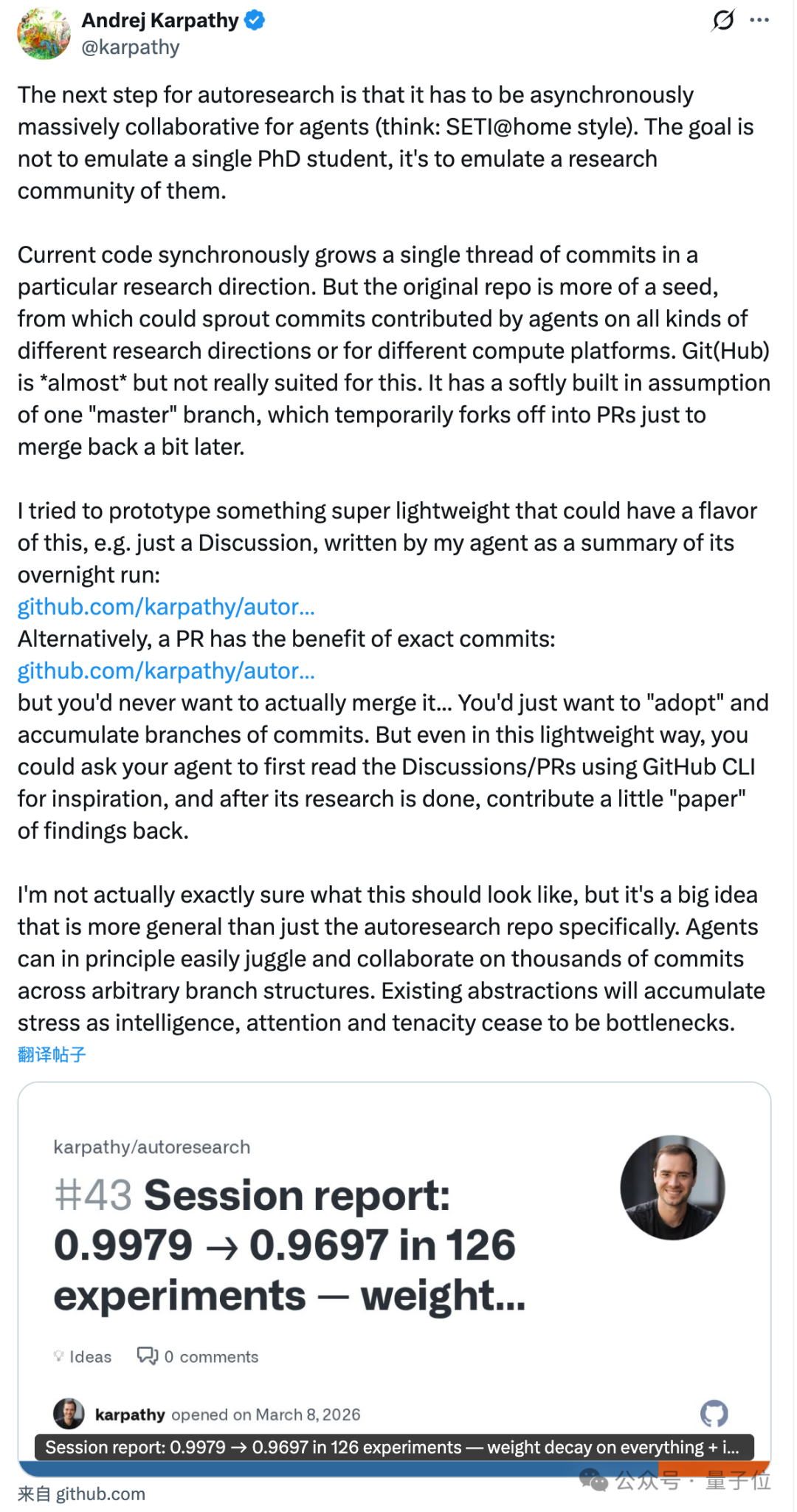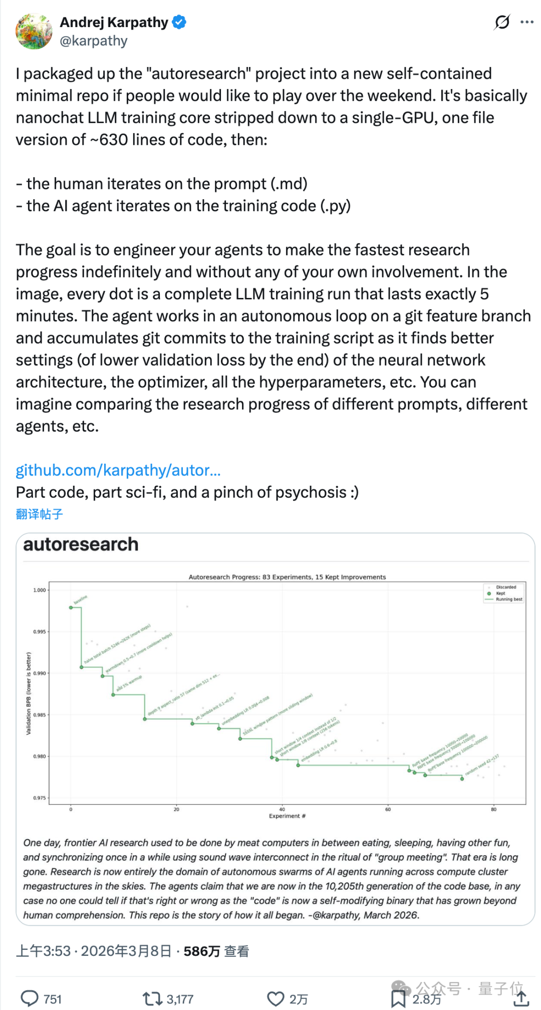 大神 Karpathy 又开源了新项目 —— 一个能够自主进化的 AI 科研循环系统。