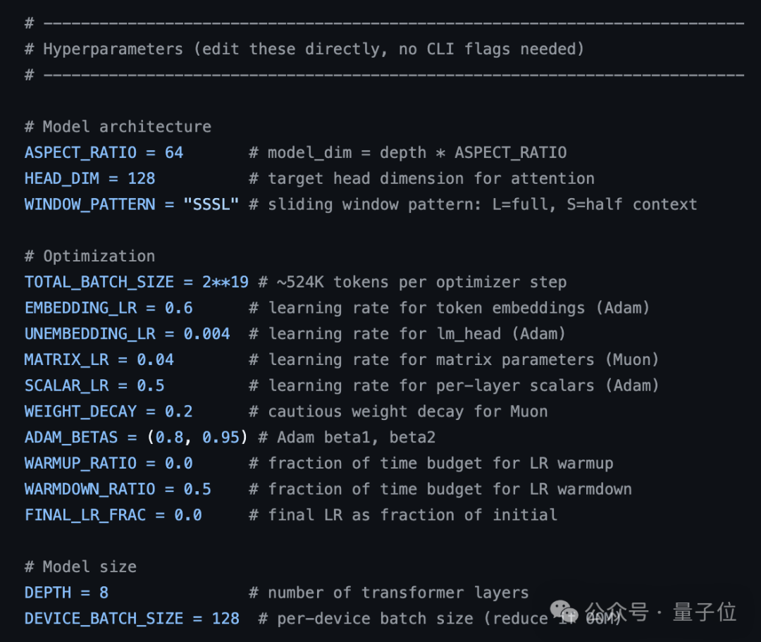 所有和训练相关的调整,都集中在这个文件里,既然 AI 的修改范围可控,也方便人类后续回看到底改了哪里。
