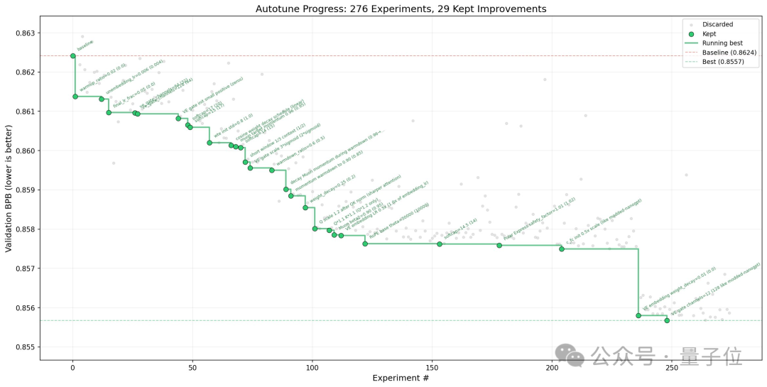 上图展示了一次近 250 轮的自主探索,AI 最终筛选并保留了 29 次有效的优化改进。