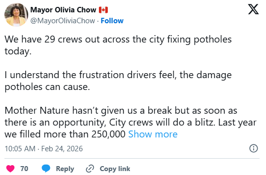 多伦多市长Olivia Chow在上个月底谈到路坑问题时表示,今年的道路损坏与这个“非常严酷的冬天”有关。她解释说,如果气温太低或正在下雪,维修队根本没办法填补路坑。“有些路坑真的大得离谱,会直接把你的轮胎吞进去,还会把车辆的定位搞坏。我自己也见过,有些坑真的非常巨大。”她当时说。