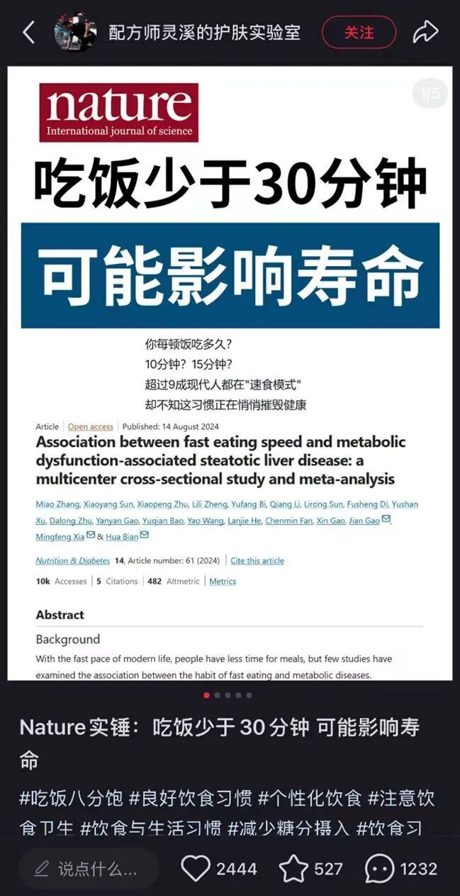 饮食与健康向来密不可分,中医理论中有“食疗”的说法,特定的饮食可以用来调理身心健康;不过,一旦饮食失当,健康也可能同样受到负面影响。近日,一则题为“Nature实锤:吃饭少于30分钟可能影响寿命”的帖子在小红书爆火,获得数千点赞、收藏、评论。网友纷纷在评论区分享自己的吃饭时长,表达对身体健康的担忧。