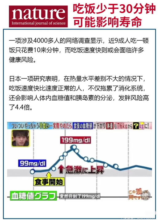 这条帖子所展示的文献与《Nature》有无关联、“网络调查”“日本研究”是否真实存在、折线图究竟是何含义,这些都要打上一个问号。最让人疑惑的是,每顿饭真的需要吃30分钟,才不会损害健康吗?本文将对以上疑点逐一展开核查。