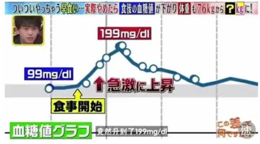 4.帖子援引了一张日文配图,看似是说明血糖值与进食速度的关联。这张图片与帖子中的说明文字并不匹配,它的来源为一档日本综艺节目,并非科学研究,而网传帖子将这张图片与上述“日本研究”混为一谈。